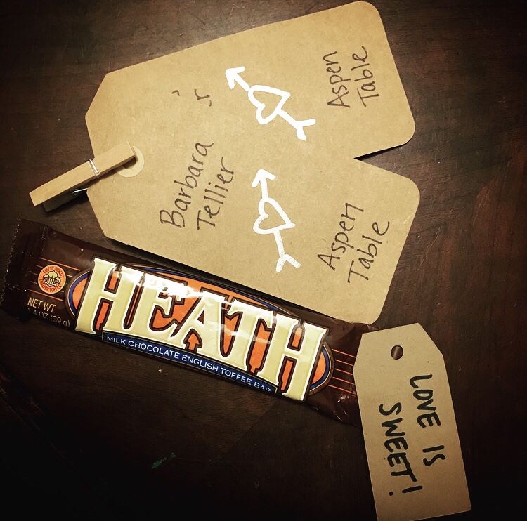I undo the clasp and am overcome. In my palm now sits two place cards and a perfectly wrapped 6 year old Heath bar, our wedding favor.