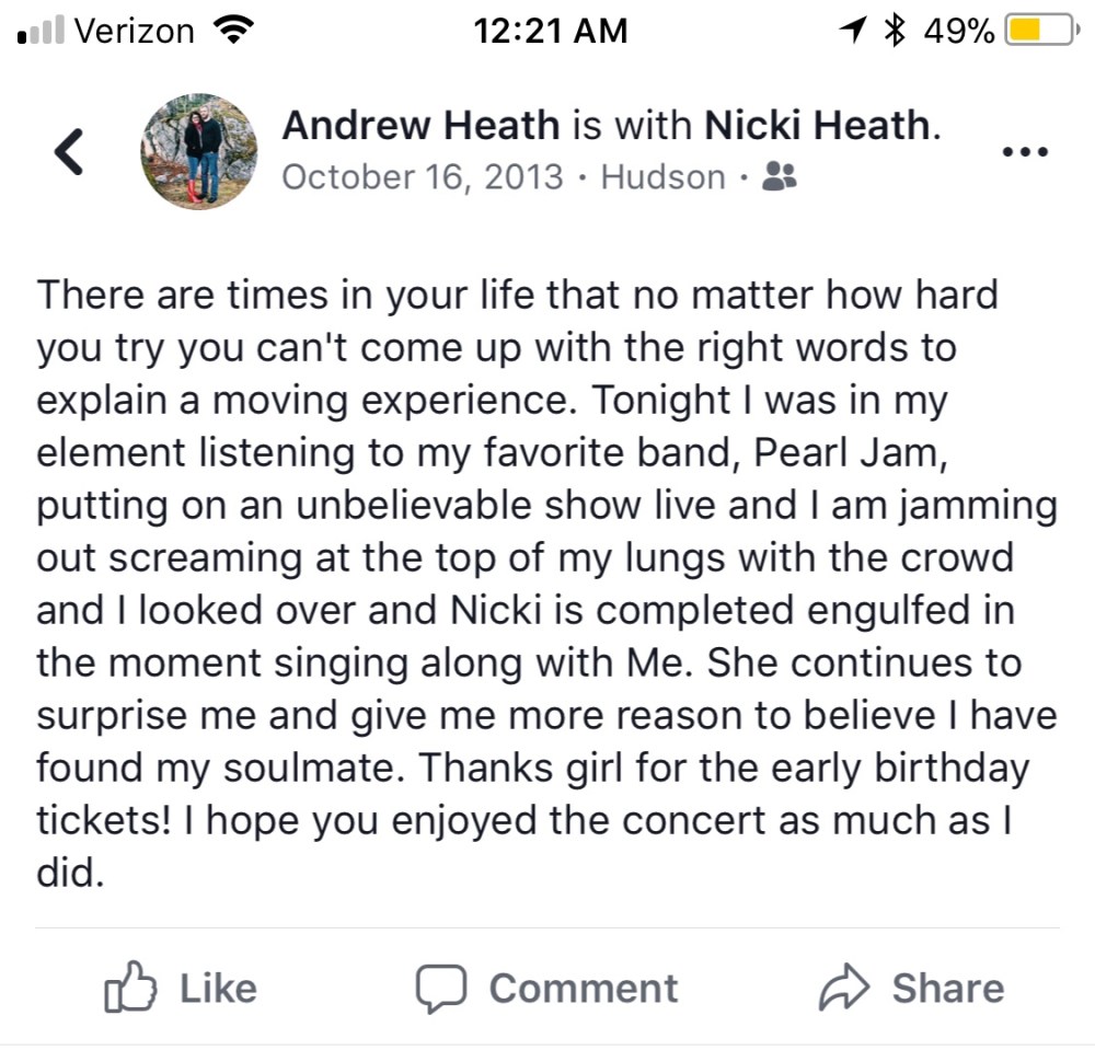 So fast forward 15 years later. They still remain my favorite band. Why? Because they have grown with me. 20 years they have come out with album after album of good music. Yes, there were a few years were you could tell they weren’t the same Seattle grudge band that made them famous, like ‘Backspacer’, but each album had a different feel and life application. Their most recent Lighting Bolt is actually one of my favorites. I had the chance to see them in Worcester, MA with Nicki for the first time the date they release the album. Here is my Facebook post from that day.