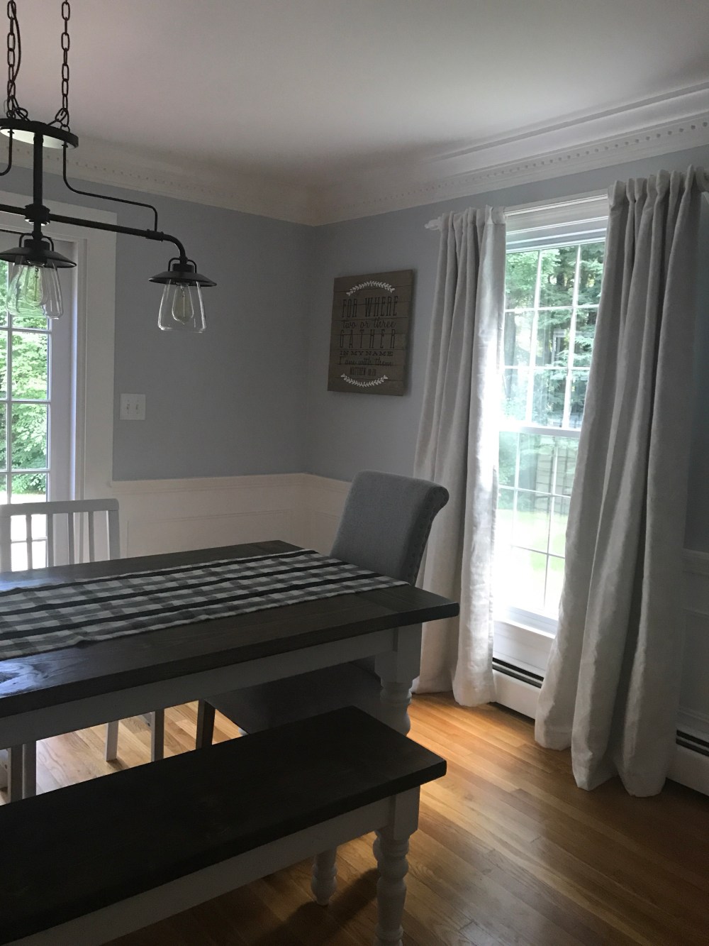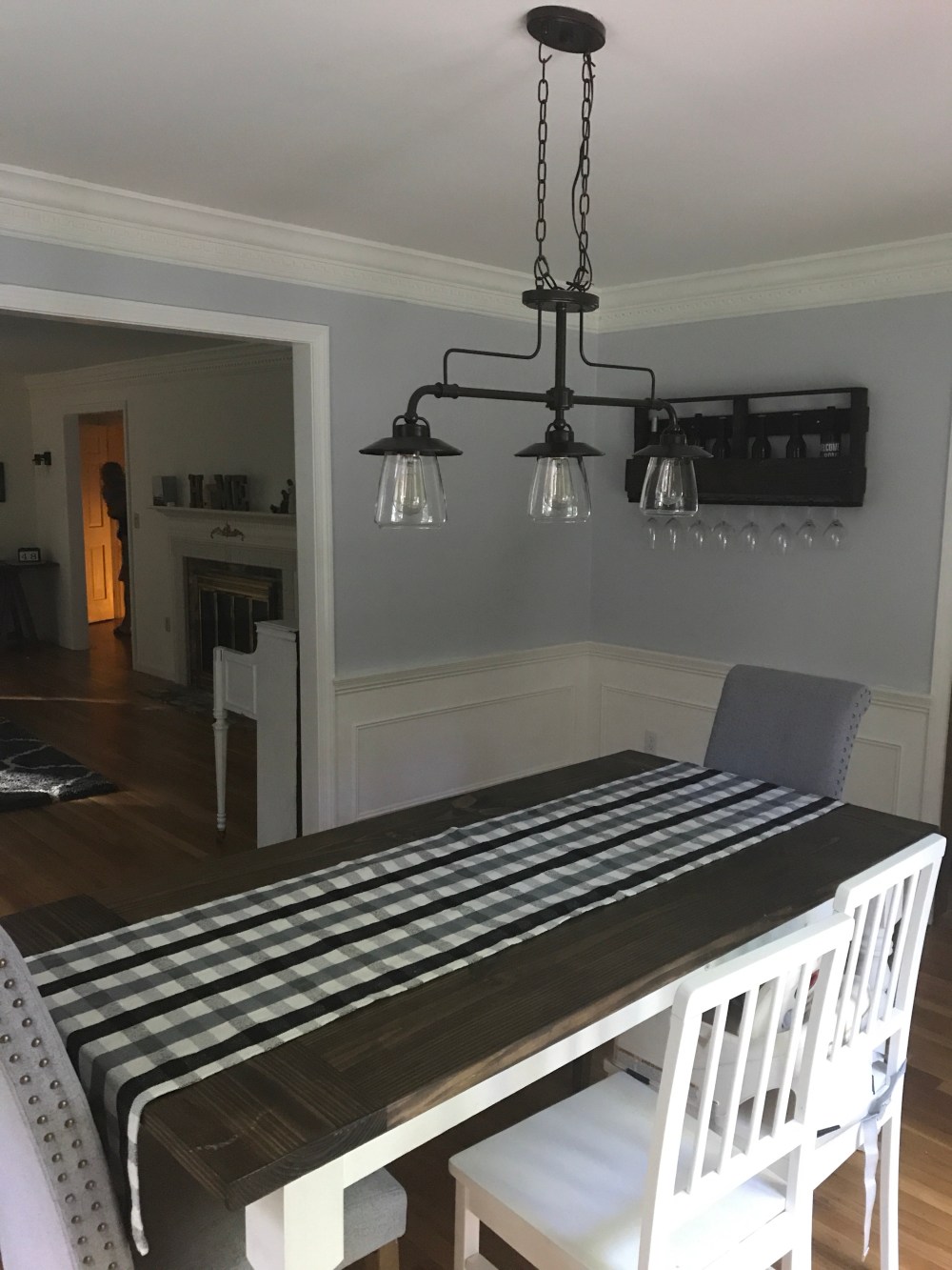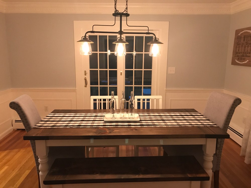 I love this room! I love that it was a disaster when we move in, adorned in wallpaper. I love that we made it a beautiful, functional, modern space. I love that we tirelessly painted the walls and the dental trim (what a job that was!) to achieve the look we desired. I love that my hubby drove two and a half hours to pick up our new farmer’s table from a couple we contacted through Etsy that also had a dream. Love. Love. Love. Check it out!