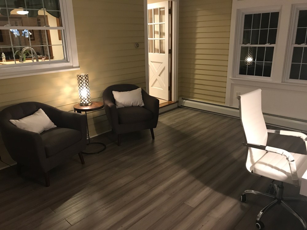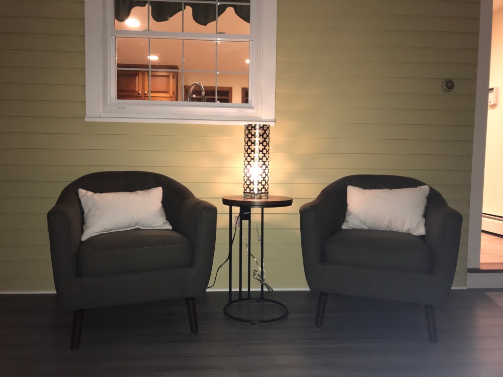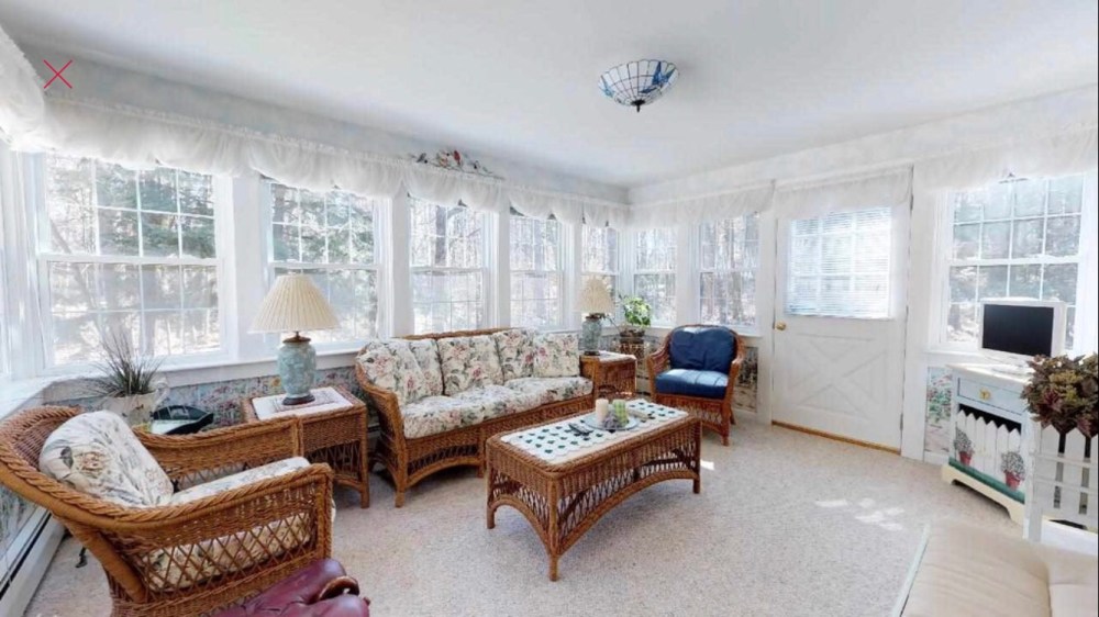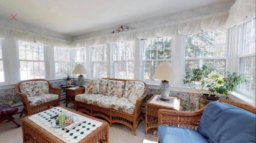 When we began, this porch area was all but white. In fact, it was a colorful array of floral and cloud wallpaper. Yes- you read that right. Clouds lined the top of the room and a garden scene lined the bottom. It was a sight to be seen. Pair that with carpet, wicker, and sheer window treatments and you’ve got yourself quite the decor. See below: